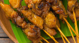 (Grilled chicken skewers served with ground peanut spicy sauce)